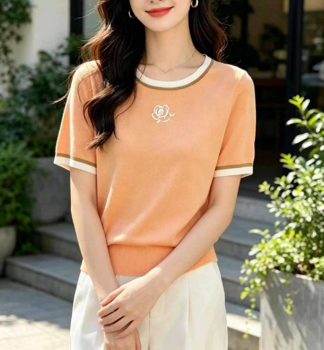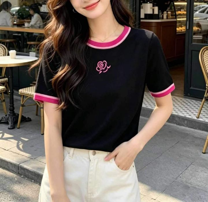 夏季新款撞色边玫瑰刺绣收腰显瘦针织短袖t桖,独立包装,均码面料柔软舒适弹力大,180件,全清5.9元超低价秒杀!