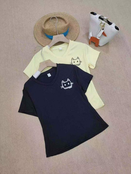 [月亮]:夏季正肩V领猫咪印花短袖T恤