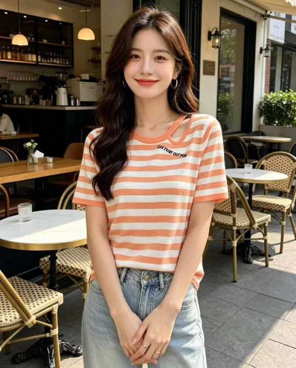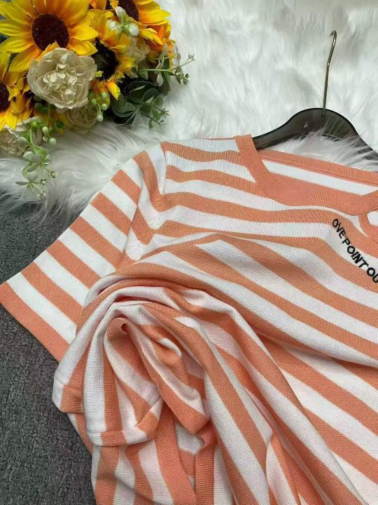 捡漏款,夏季新款宽松百搭撞色条纹刺绣设计款针织短袖...
