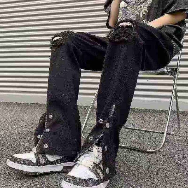☕️夏季黑色破洞牛仔裤男欧美高街拉链直筒裤潮牌阔腿...