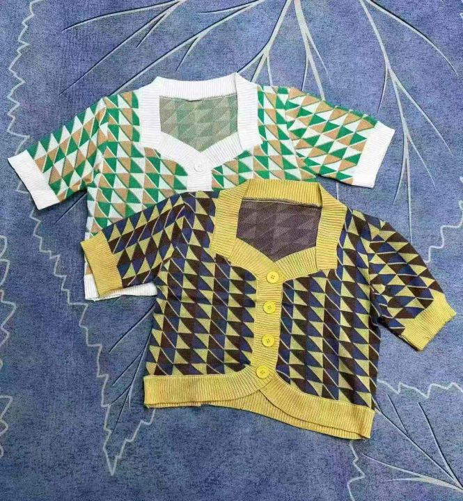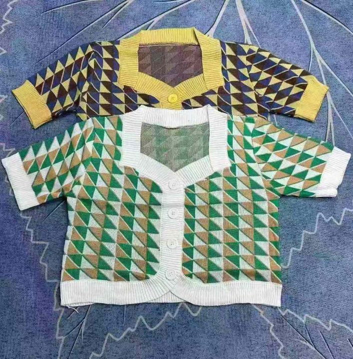 夏季韩版ins方领复古格子拼色针织开衫女显瘦洋气短袖开衫,独立包装,1250件左右,清6.8,分➕0.5