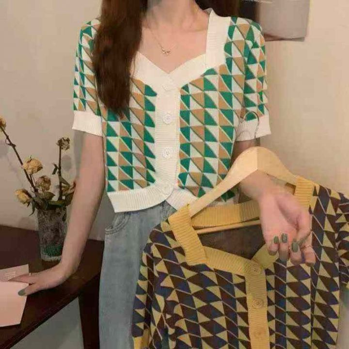夏季韩版ins方领复古格子拼色针织开衫女显瘦洋气短袖...