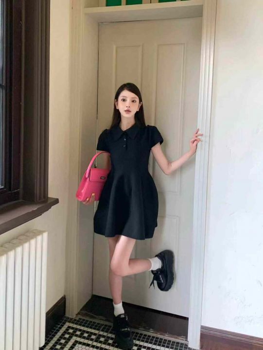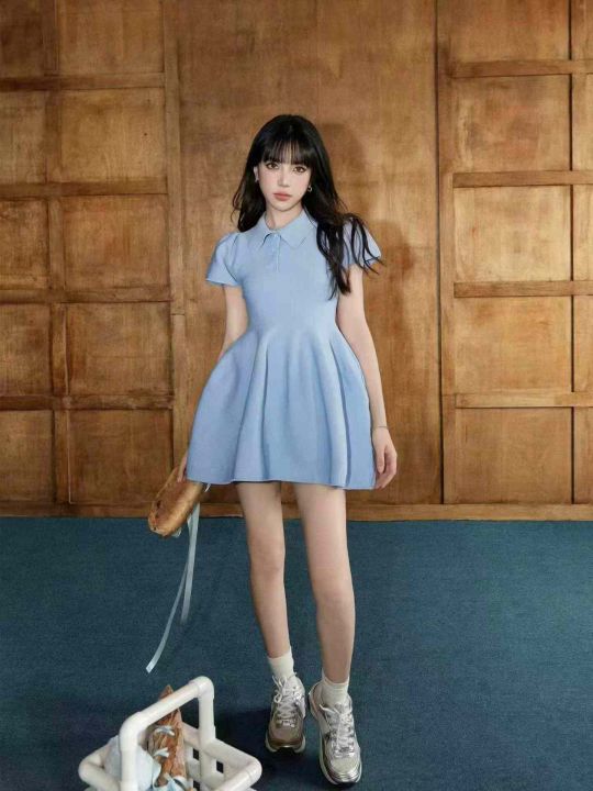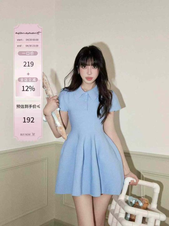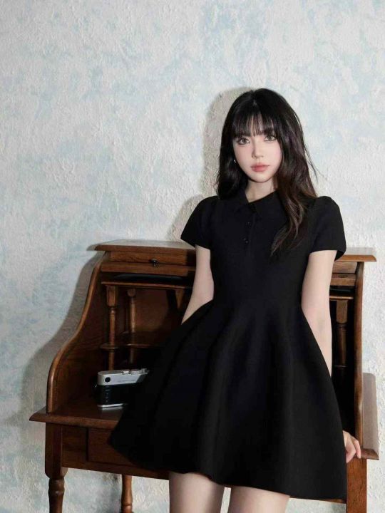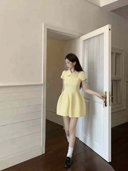 新款衬衫领弹力娃娃裙设计感收腰显瘦蓬蓬a字连衣裙夏...