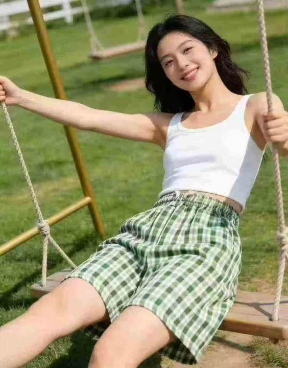 高腰抽绳设计,宽松阔腿格子五分裤版型,裤身有自然垂...