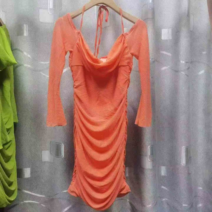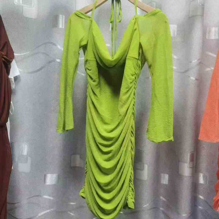 XULU原创纯色褶皱水晶麻纱时尚气质修身长袖拼接一字领吊带连衣裙,294条,S一3xL,8.8卖,少数包装。