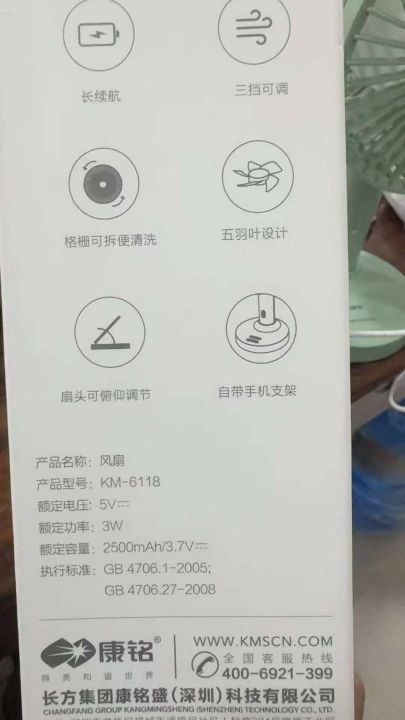 康铭 双用手持风扇 个头比较大 内置2500毫安电池 无刷...