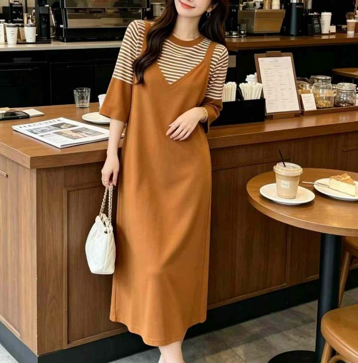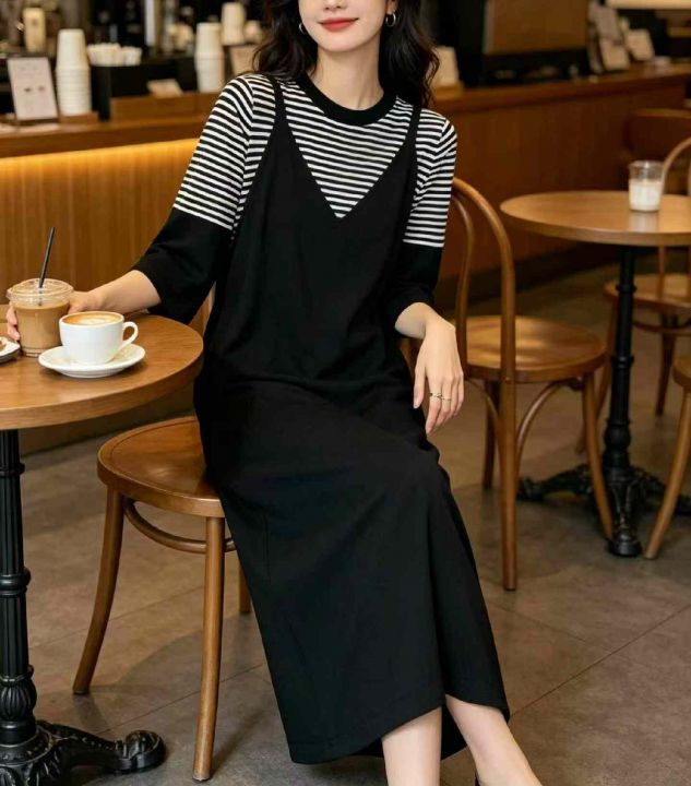 捡漏款,春夏季新款韩系撞色条纹针织吊带连衣裙+撞色条纹针织衫2件套,独立包装,均码面料柔软舒适有弹力,63套,全清9.9元超低价秒杀!