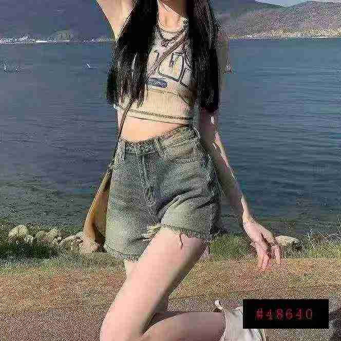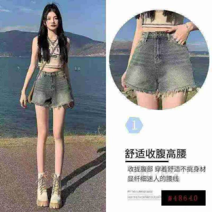 复古毛边夏季辣妹高腰显瘦遮肉弹力牛仔短裤,单款单色...
