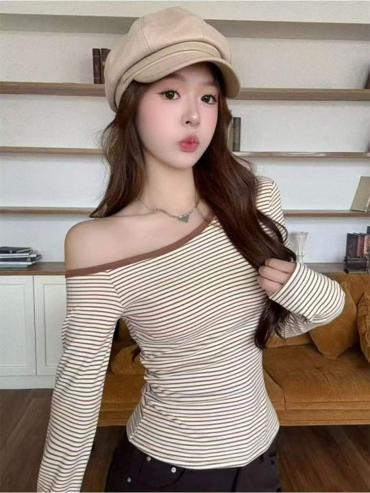 秋冬新款性感辣妹设计款撞色条纹长袖显瘦包芯纱针织套...
