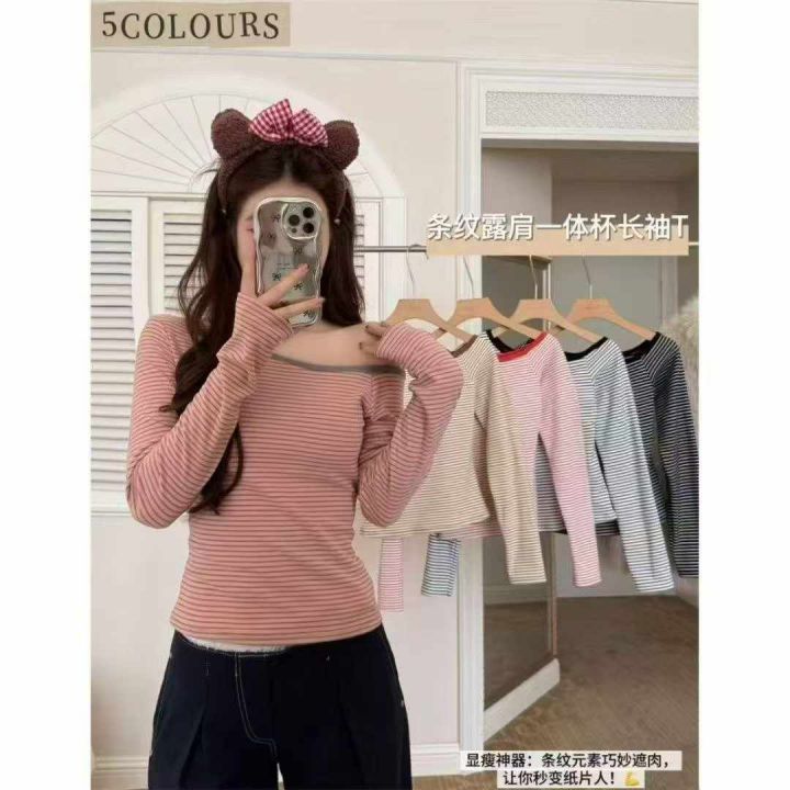 秋冬新款性感辣妹设计款撞色条纹长袖显瘦包芯纱针织套...