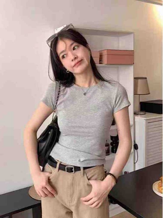 ☕️纯棉韩系正肩圆领纯色短袖T恤女夏季收腰修身设计...
