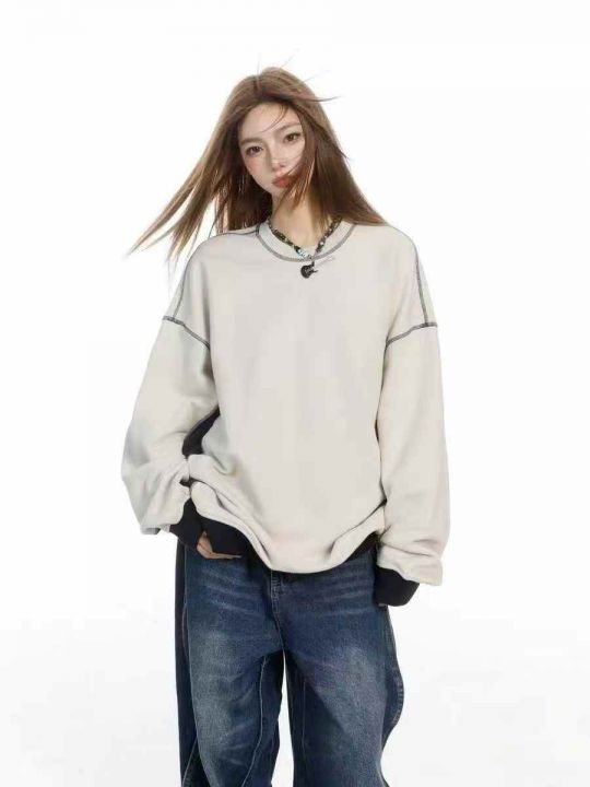 ☕️纯棉毛圈卫衣美式复古圆领拼接撞色插肩卫衣女春秋款上衣287件全清8.8元...