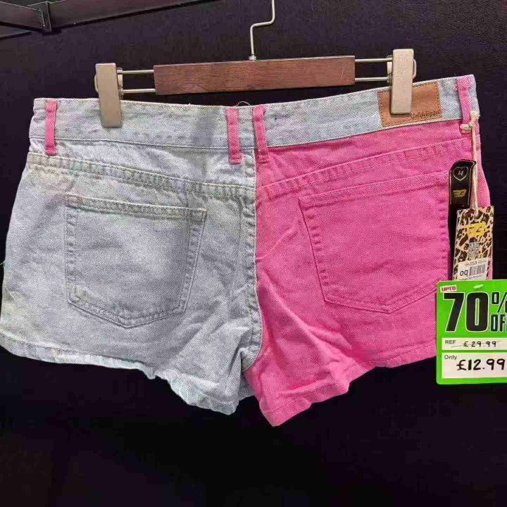 英国时尚品牌golddigga拼色粉蓝牛仔短裤尺码14码独立...