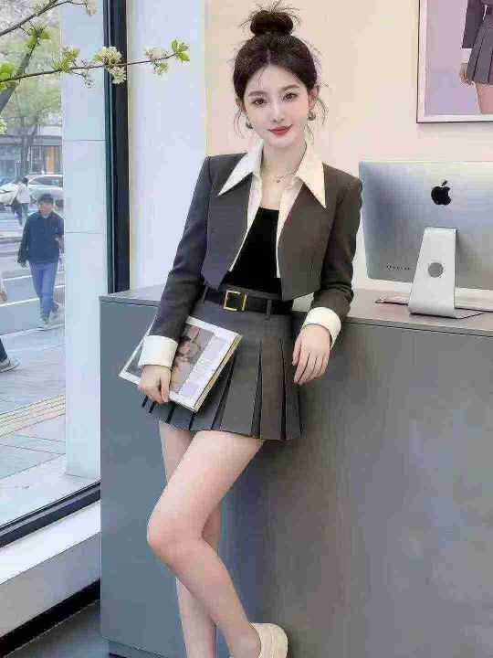 全清价11.8设计感气质减龄假两件套西服学院风百褶裙短裙套装,含皮带,独立...