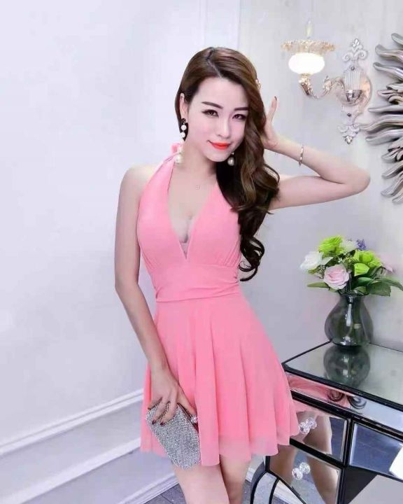 法式性感低胸V领挂脖式无袖连衣裙街头辣妹修身显身材大摆裙,独立包装,S -2 xL码,2 80件左右,全清6.8