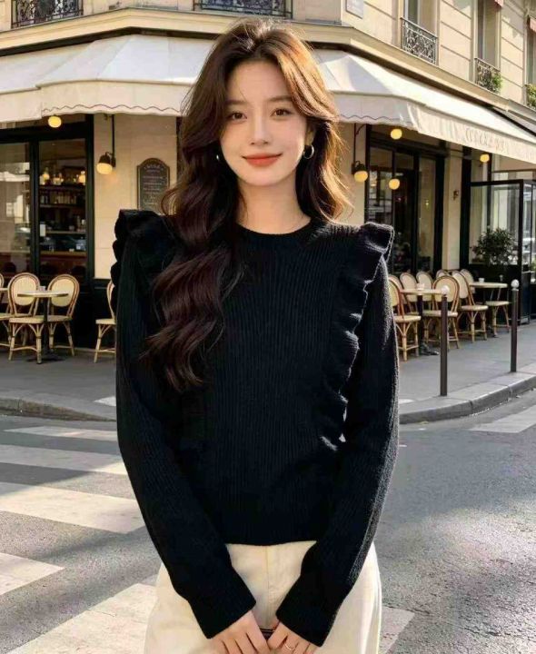 春季新款复古法式宽松百搭显瘦木耳边设计款圆领套头毛...