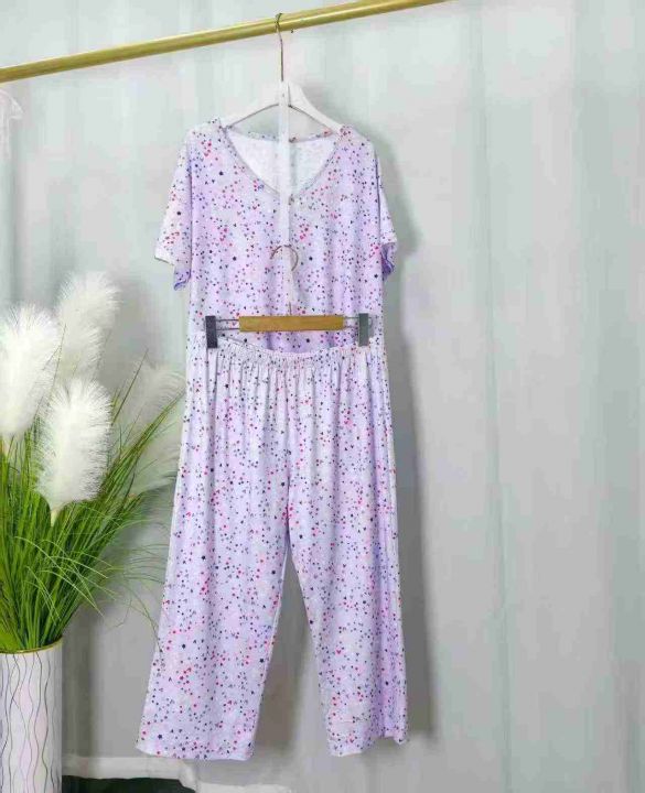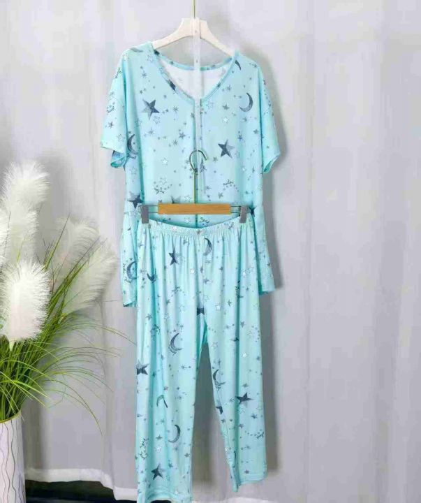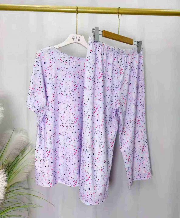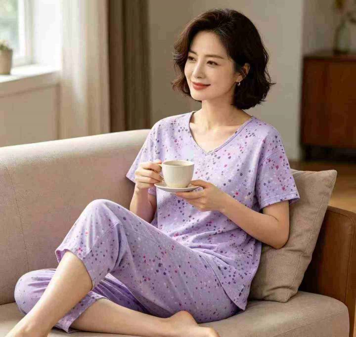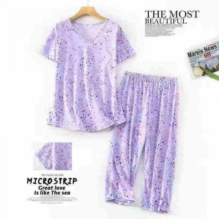 女夏季短袖七分裤套装针织棉家居服套装V领卡通印花宽松大码睡衣:独立包装.货品干净漂亮,码数:S—3XL:数量:143件套.[庆祝]