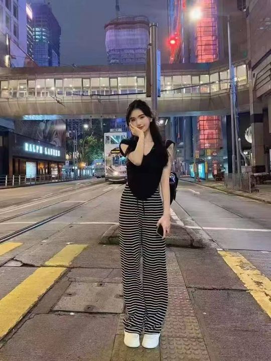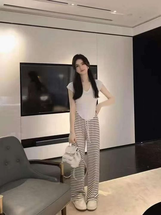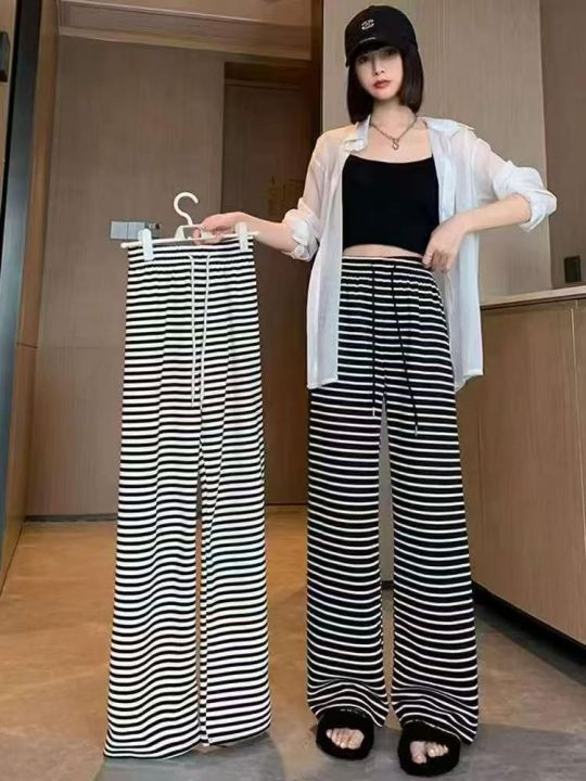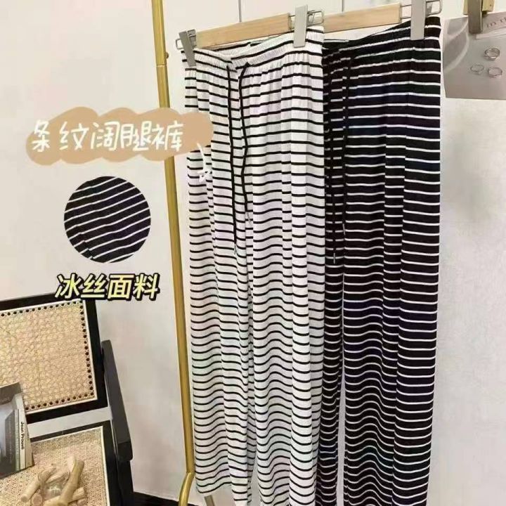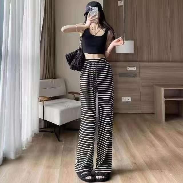 ☕️1200条全清9.5元,夏季休闲裤新款慵懒风宽松直筒高腰阔腿条纹裤子女拖地长裤,分货100件打包9.9元 ,均码 黑色 白色 冰丝面料 ,独立包装