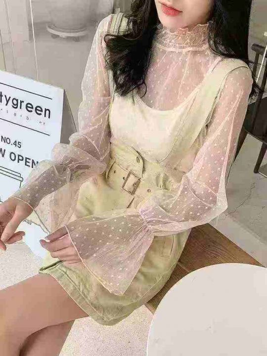 270件春装新款蕾丝波点网纱打底衫女内搭超仙喇叭袖纱...