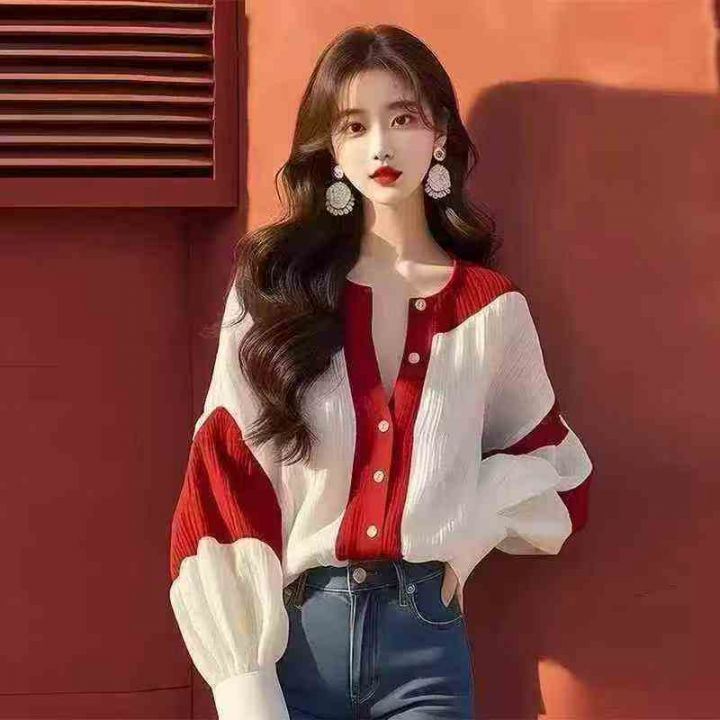 ❄️高级感别致红白撞色灯笼袖网红款雪纺衬衫,单款单...