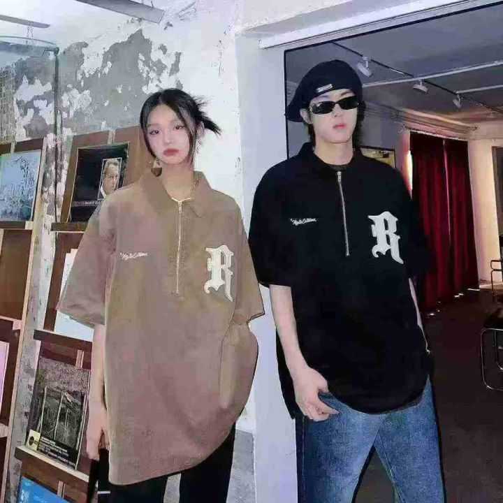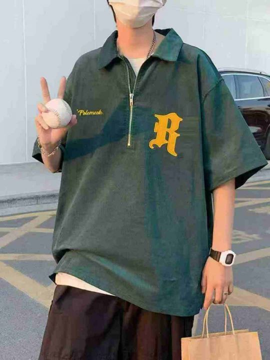 工装半拉链短袖polo衫男宽松美式刺绣翻领T恤,前后重工刺绣工艺, 数量:3022件 码数:m-xL码,版型够大,分货加价,独立包装(货号322#26)