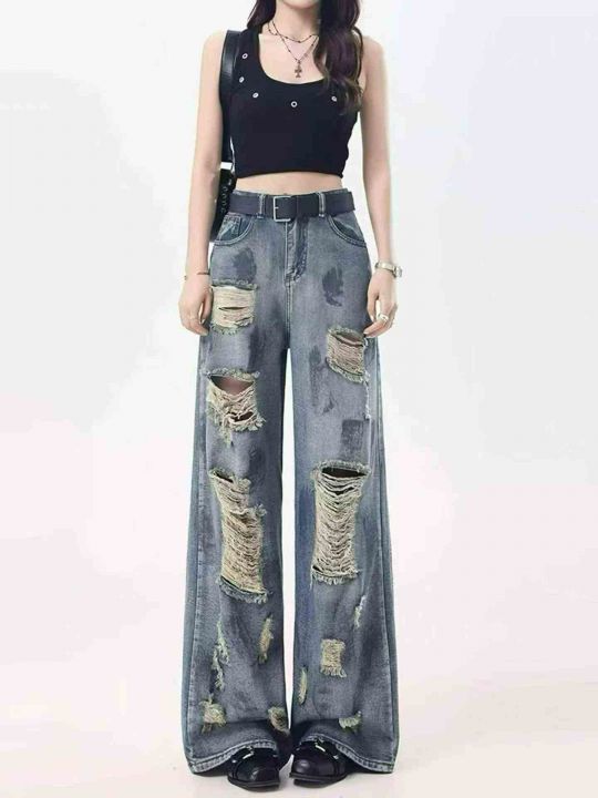复古扎染废土风破洞女牛仔裤水洗垂感阔腿拖地裤,码数...