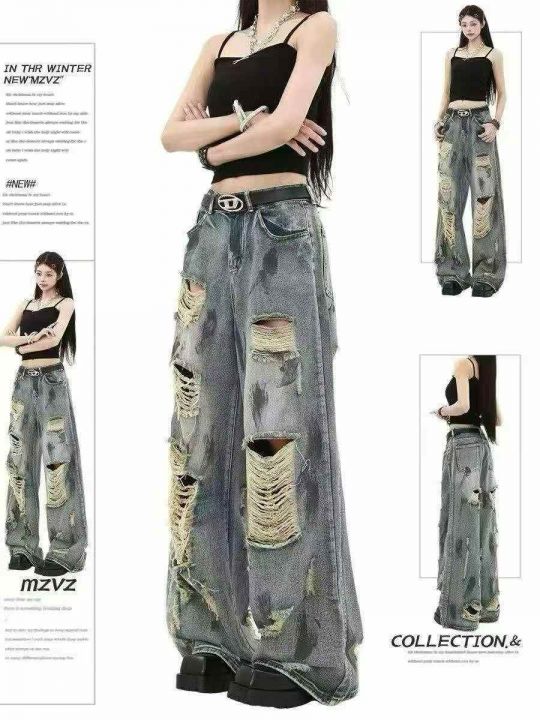 复古扎染废土风破洞女牛仔裤水洗垂感阔腿拖地裤,码数...