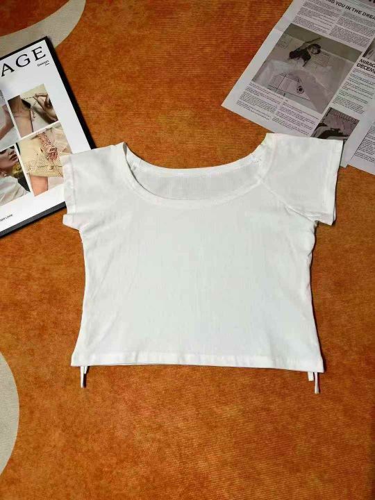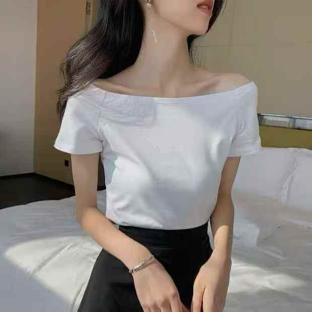 纯棉辣妹一字露肩短袖T桖 89件(黑色79件 白色10件)全清5.8元,正品独立包装,码数:(S到L),短袖t恤女装新款夏季一字肩性感露锁骨露肩修身上衣小众设计感