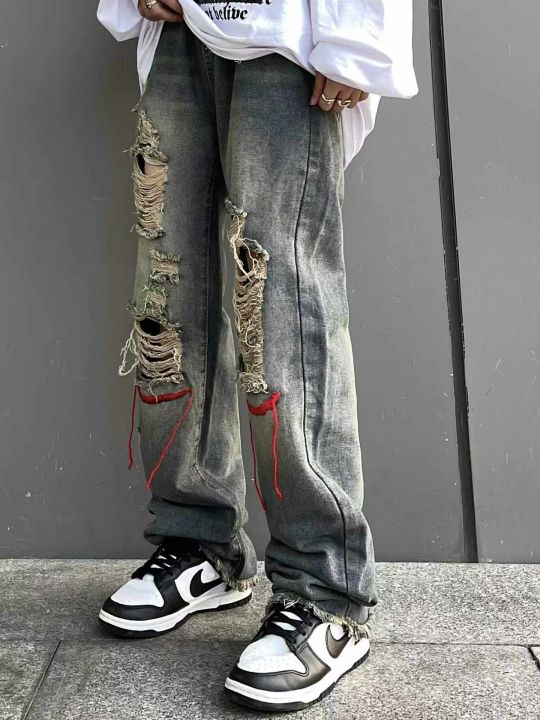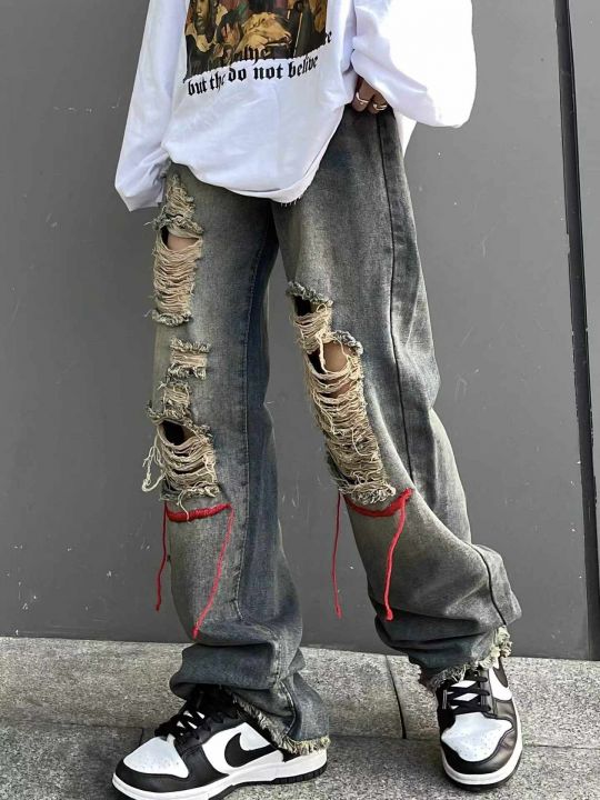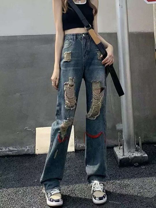男女同款美式复古破洞阔腿牛仔裤女夏季百搭高腰宽松显...