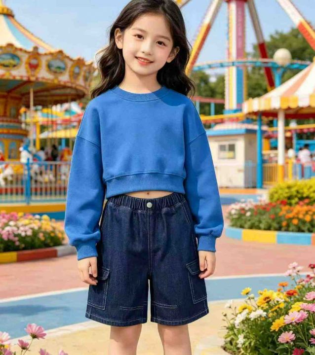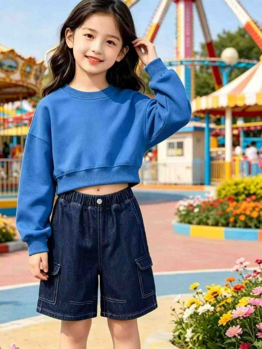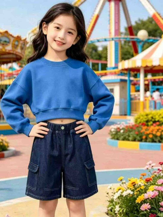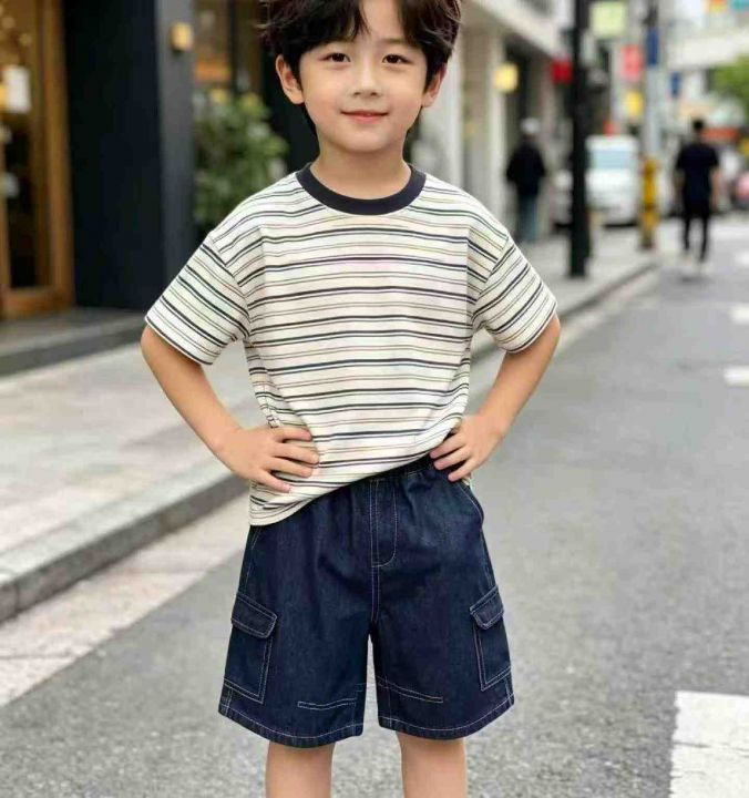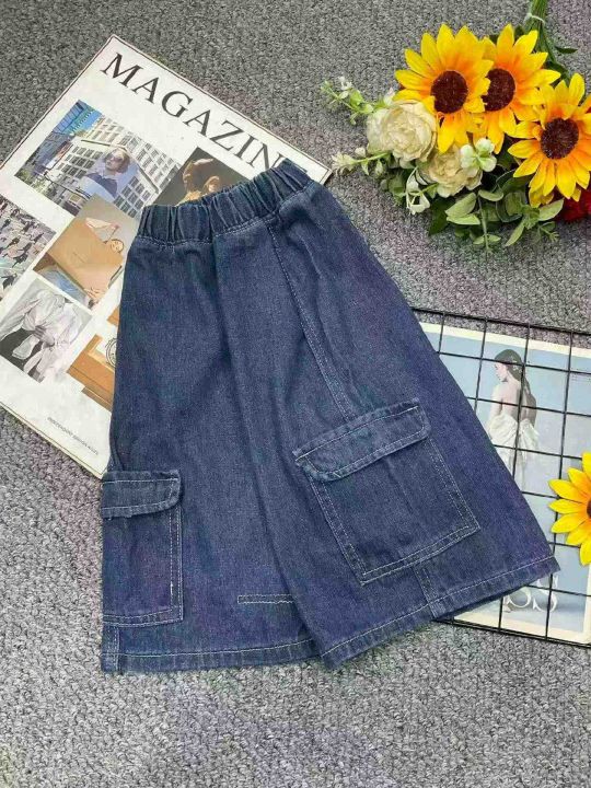 夏季新款男女童童装网红复古洗水棉多袋工装牛仔短裤,...