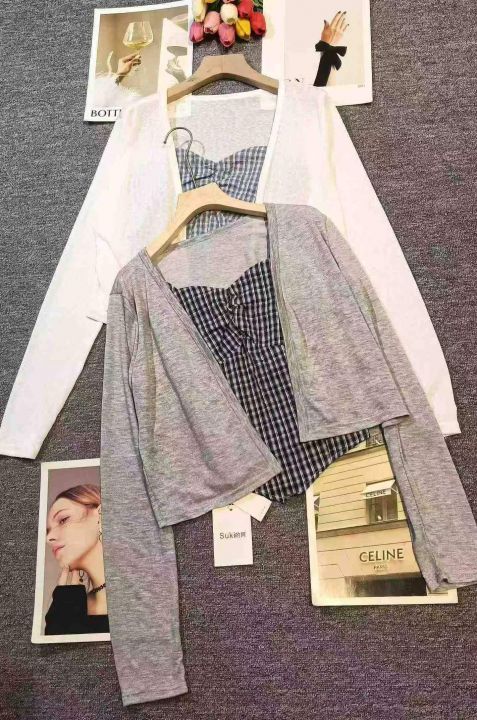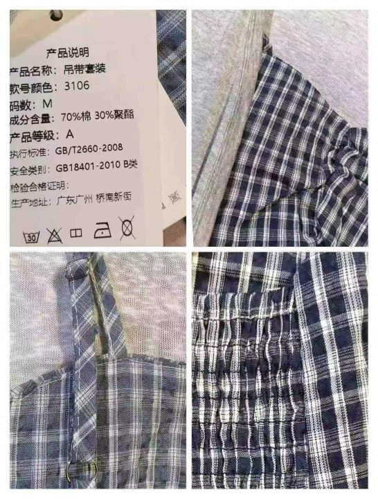 韩系不规则设计感格子吊带➕防晒开衫套装,[爱心]135套左右,灰色为主,码数S-L,穿80-130斤,万佳档口货,原包装️无瑕疵,[666]实体店品质,分货加一