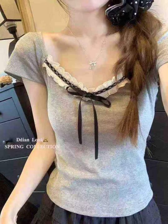 法式蕾丝拼接短袖459件6.5,面料柔软有弹力,蝴蝶结蕾...