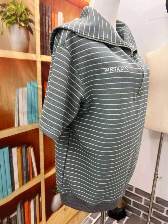 全清7.8元/件64件灰蓝翻领条纹半拉链针加厚宽松外穿打...