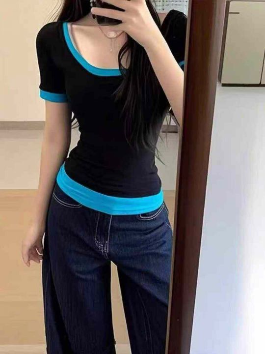 [月亮]:5.8秒杀清480件[月亮]:辣妹U领垂感拼色设计假两件T恤[月亮]:1234...