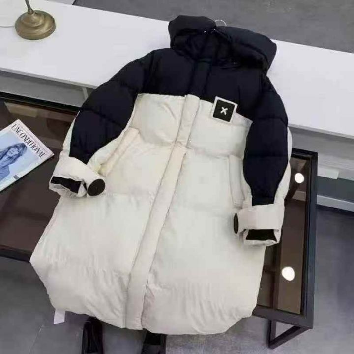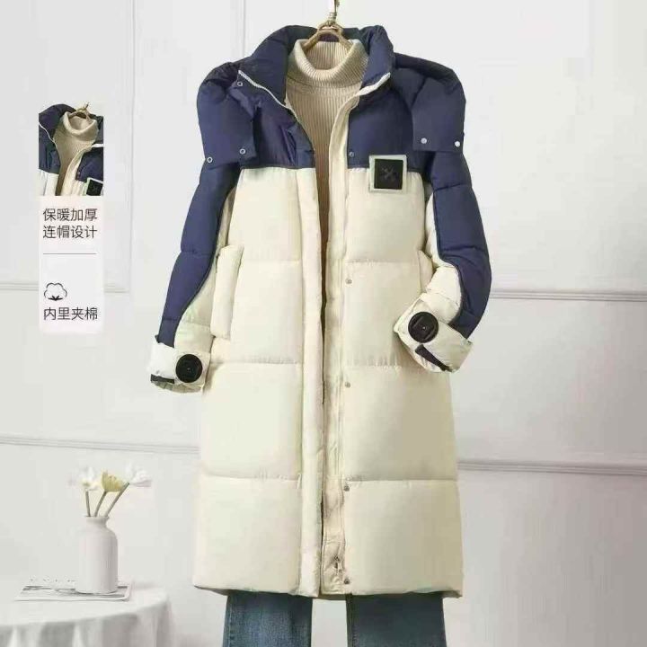 韩系加厚宽松大版拼接款连帽大长款棉服外套