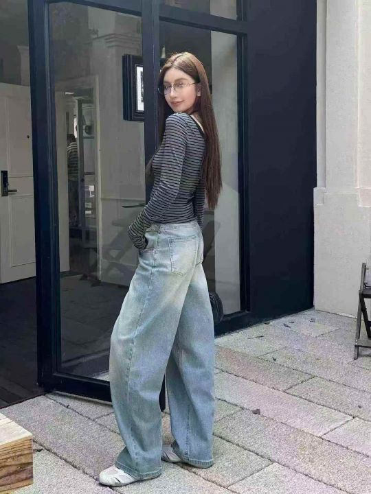 580件韩系松弛感复古做旧小辣妹高腰直筒烟灰色阔腿休闲牛仔裤,尺码2-5(S-X...