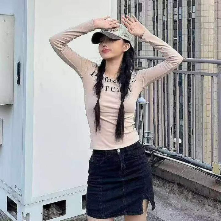 [月亮]:简约字母印花U领辣妹长袖上衣