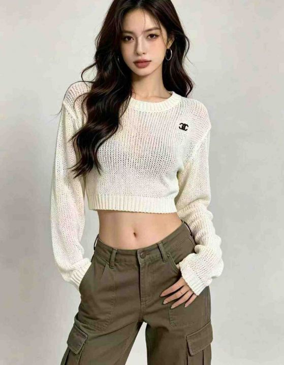 春夏季新款网红镂空钩花刺绣小标长袖针织衫,独立包装...
