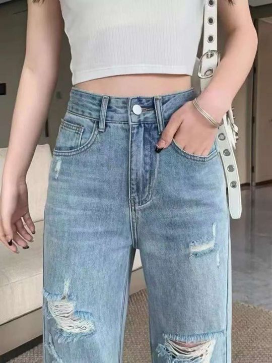 破洞阔腿牛仔裤女春夏薄款高腰宽松拖地直筒裤子127条全清11.8元,码数SML,...