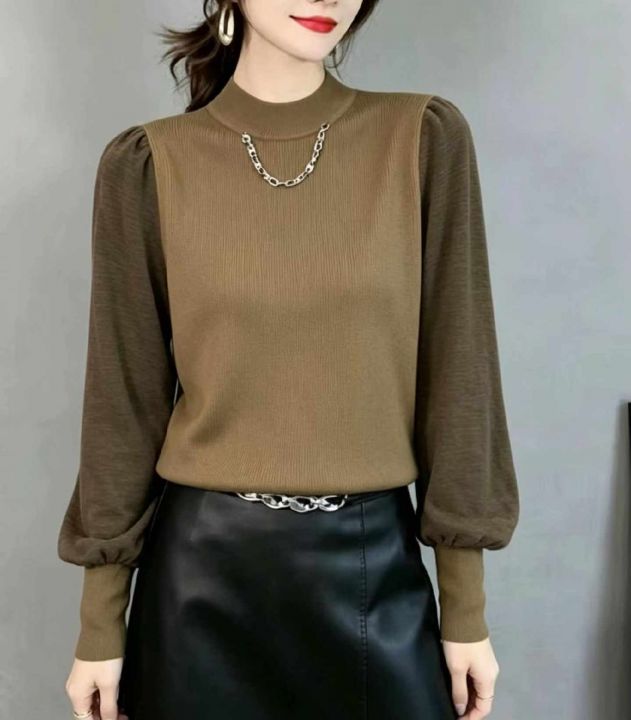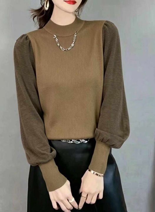 春季新款欧洲站时尚链条设计款拼接灯笼袖高档套头毛衣...