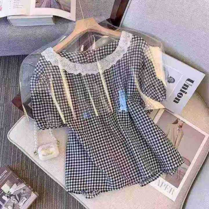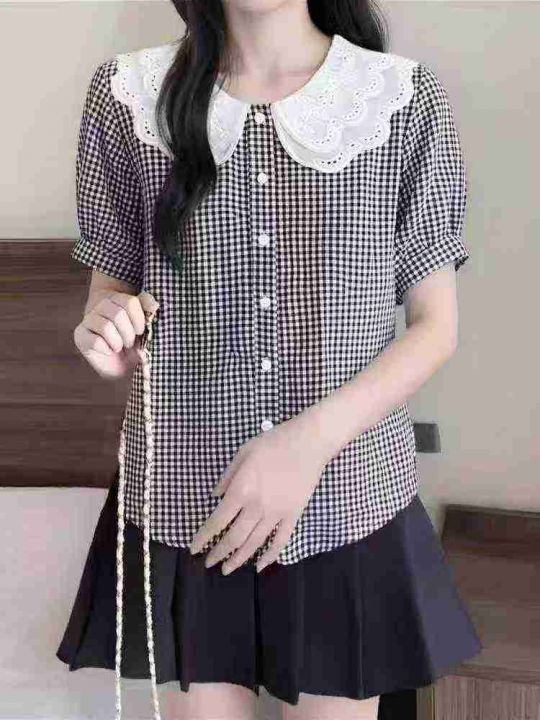 ☕️娃娃领短袖衬衫女夏季花边蕾丝格子衬衣宽松显瘦法...