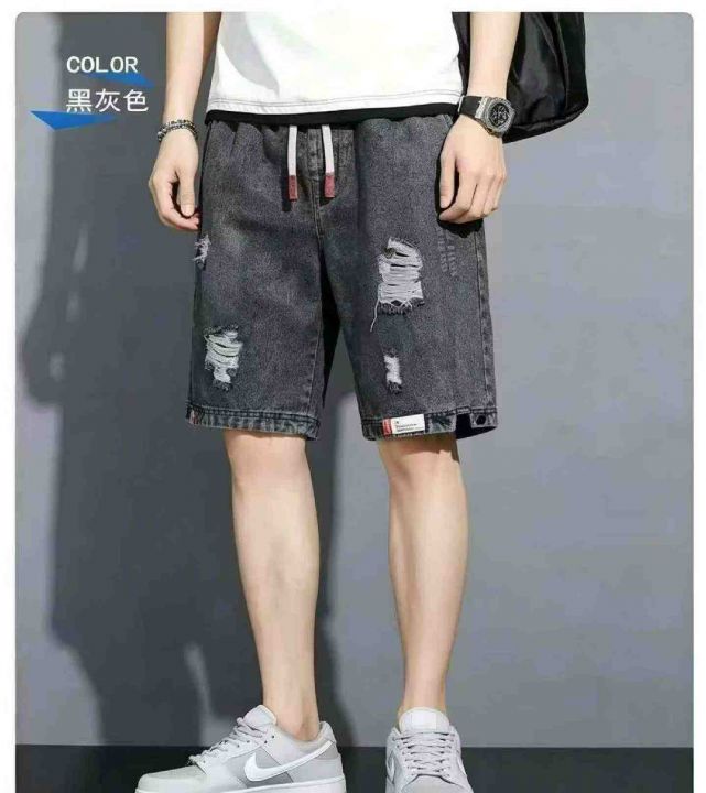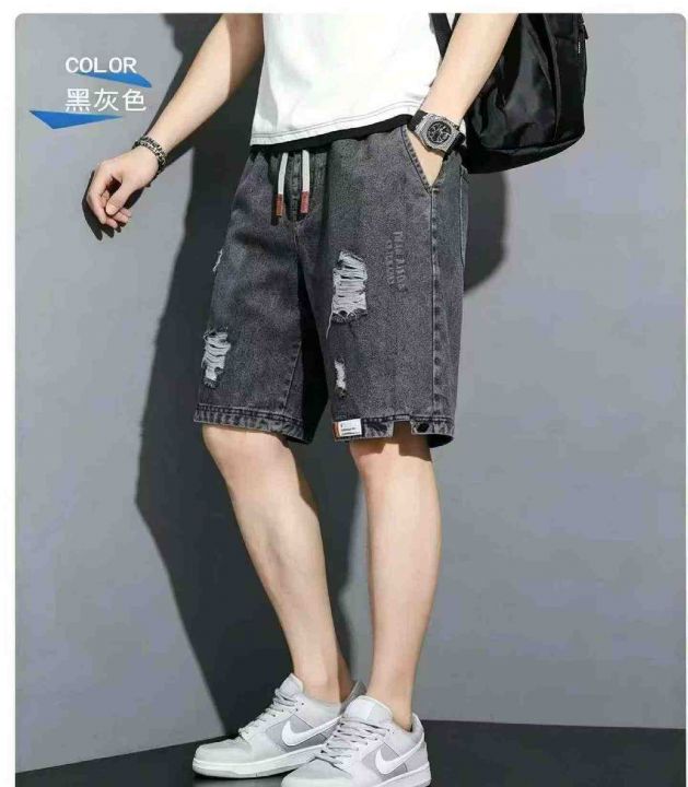 夏季新款男士松紧腰破洞设计款牛仔短裤,独立包装带腰...
