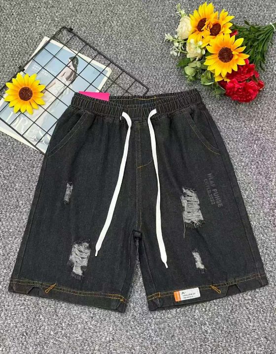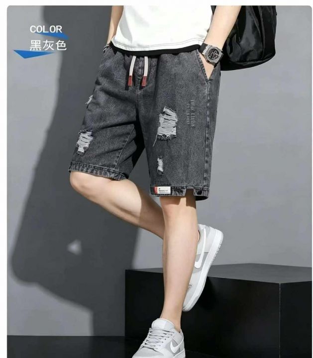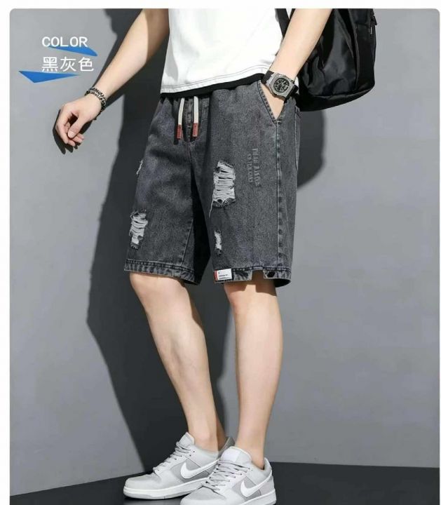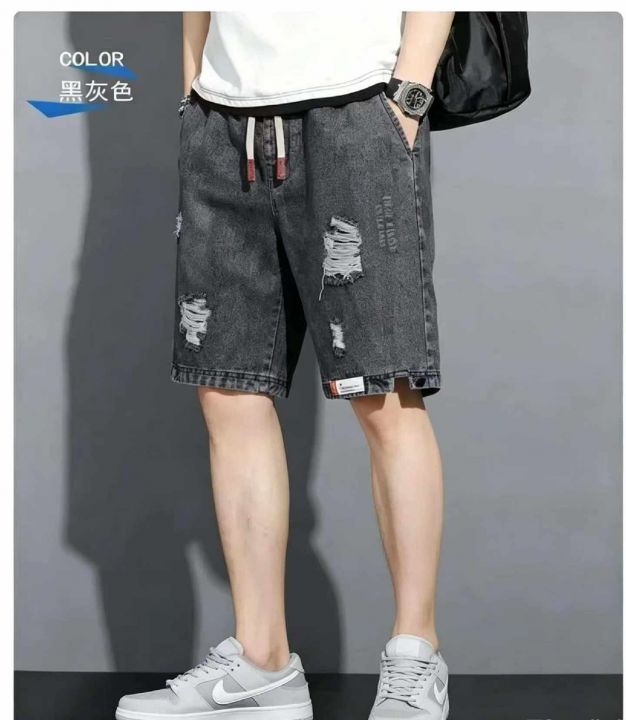 夏季新款男士松紧腰破洞设计款牛仔短裤,独立包装带腰...
