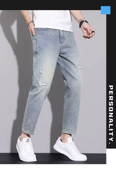 夏季超薄牛仔裤男士宽松直筒九分裤子新款弹力小脚破洞...