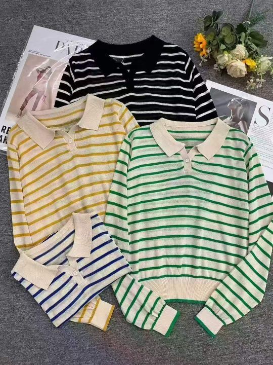 早秋新款韩系宽松高级感撞色条纹百搭POLO领长袖针织毛...