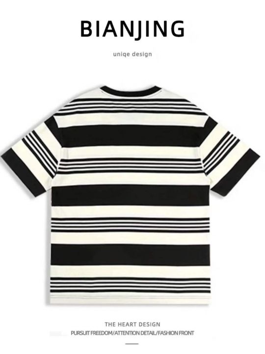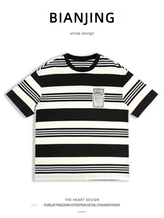 6.9清210件高街美式徽章条纹短袖t恤男夏季潮牌落肩宽松百搭休闲半袖情侣上衣!