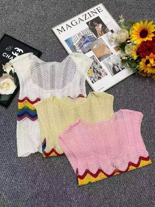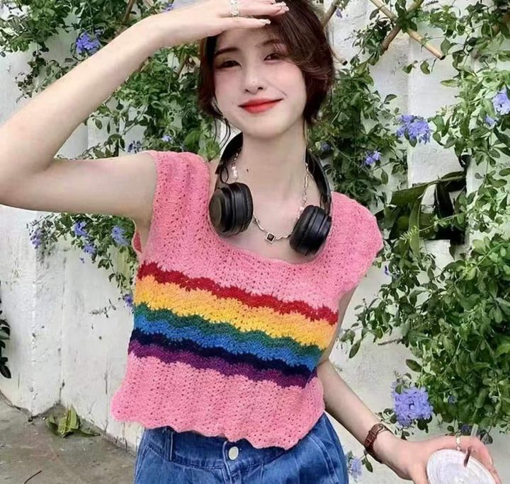 夏季新款彩虹镂空网红设计感短款冰丝宽松针织吊带背心...