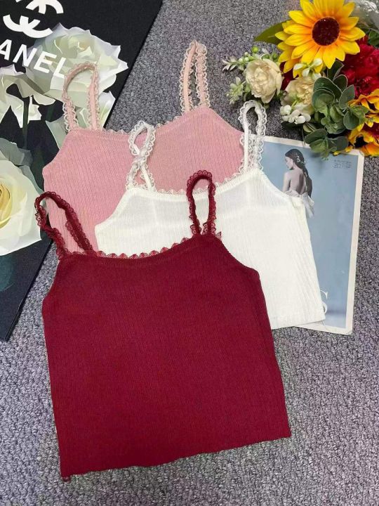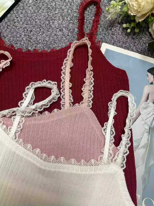 夏季新款纯欲奶甜法式别致甜辣蕾丝拼接针织吊带背心,...