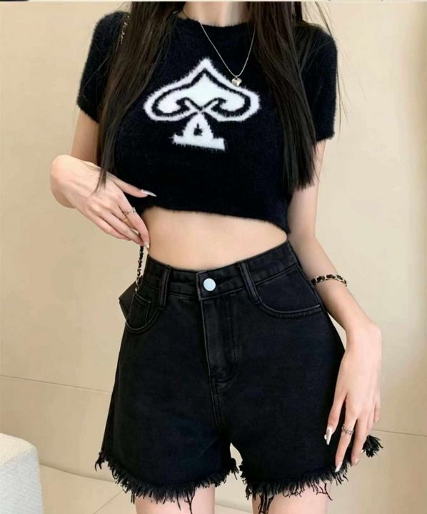 夏季新款港味设计感性感辣妹绑腿弹力修身显瘦百搭洗水棉牛仔短裤,独立包装...