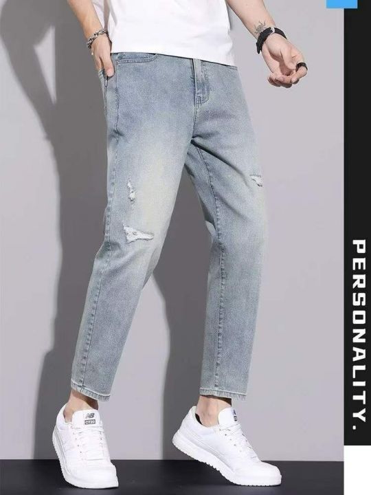 夏季超薄牛仔裤男士宽松直筒九分裤子新款弹力小脚破洞休闲裤180条全清9.8元...